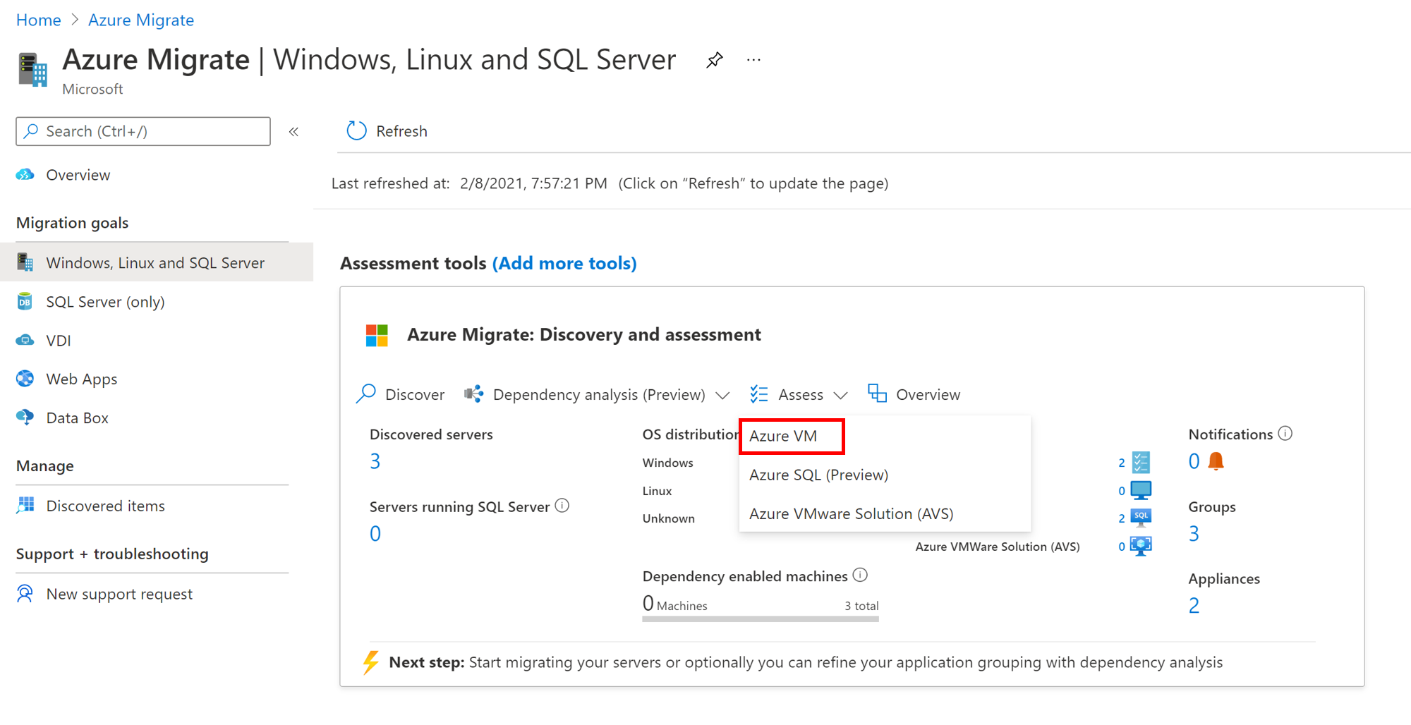 In Windows, Linux and SQL Server > Azure Migrate: Discovery and assessment, select the number next to Assessments.