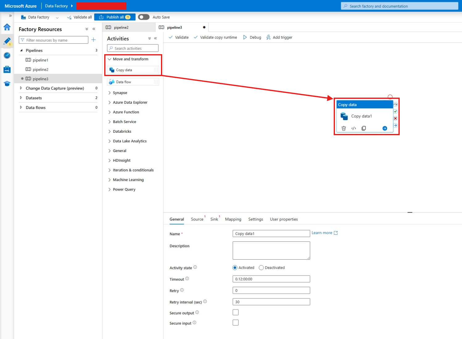 Under Move and transform, drag and drop the Copy data activity into the pipeline.
