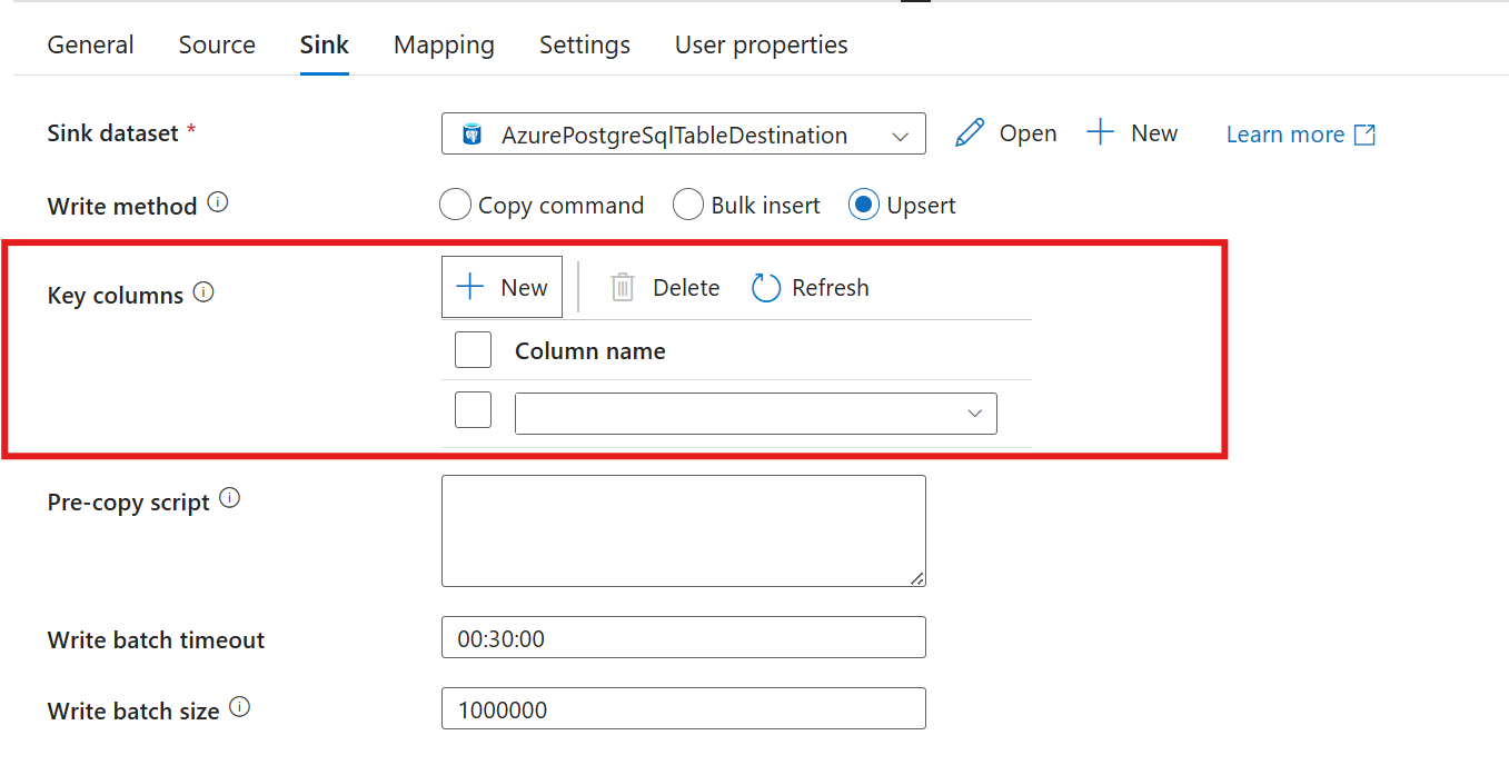At the Sink tab, select or create an Azure Database for PostgreSQL dataset as Sink dataset, and choose the Write method. For more information, see Azure Copy Activity and Write Method.