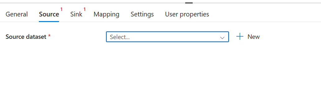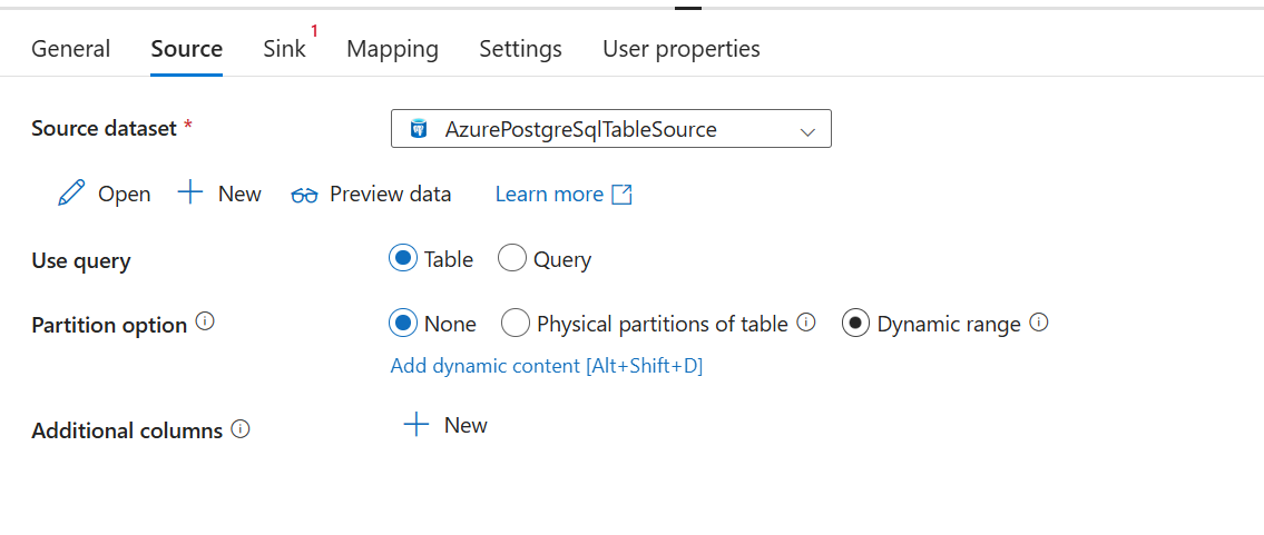 At the Source tab, select or create a Source dataset. In this example, select an Azure Database for PostgreSQL table.