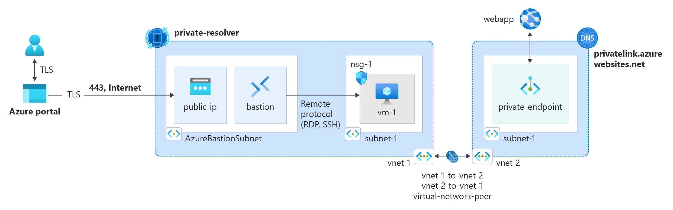 | Test virtual machine | vm-1 | Virtual machine used to test the private endpoint connection to the web app and DNS resolution. |