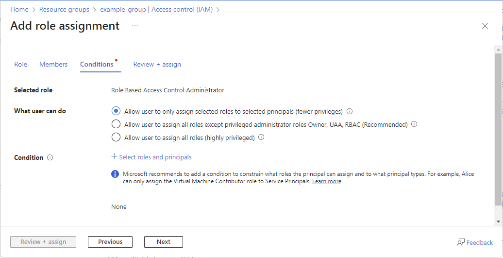 Allow user to only assign these roles to principal types you select (users, groups, or service principals)Constrain roles and principals Allow user to only assign roles you select