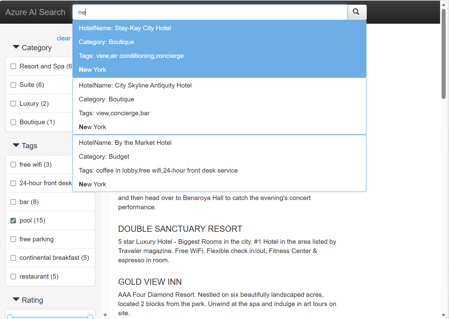 The search service supports filters and faceted navigation, which is often rendered as a sidebar. Facets are based on fields attributed as filterable and facetable in your index schema.