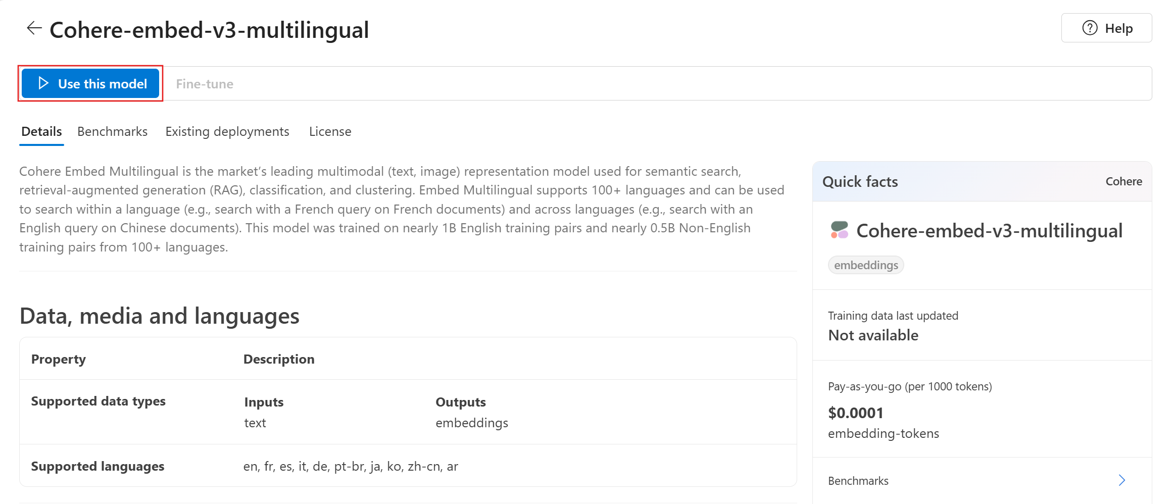 The workflow includes model deployment steps. The model catalog includes embedding models from Azure and other companies. Deploying a model is billable per the billing structure of each provider.