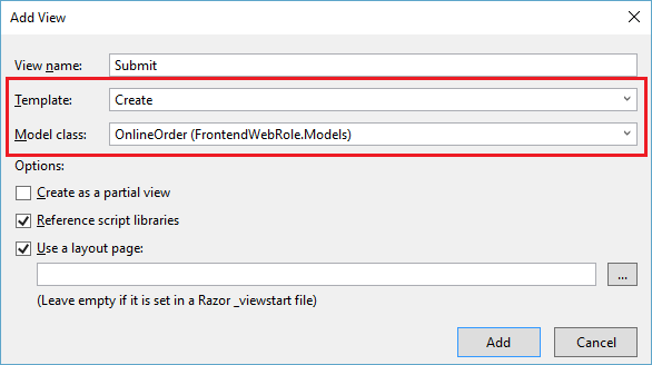 Submit()method you created earlier. Right-click within theSubmit()method (the overload ofSubmit()that takes no parameters) in the HomeController.cs file, and then choose Add View.In the Add New Scaffolded Item dialog box, select Add.