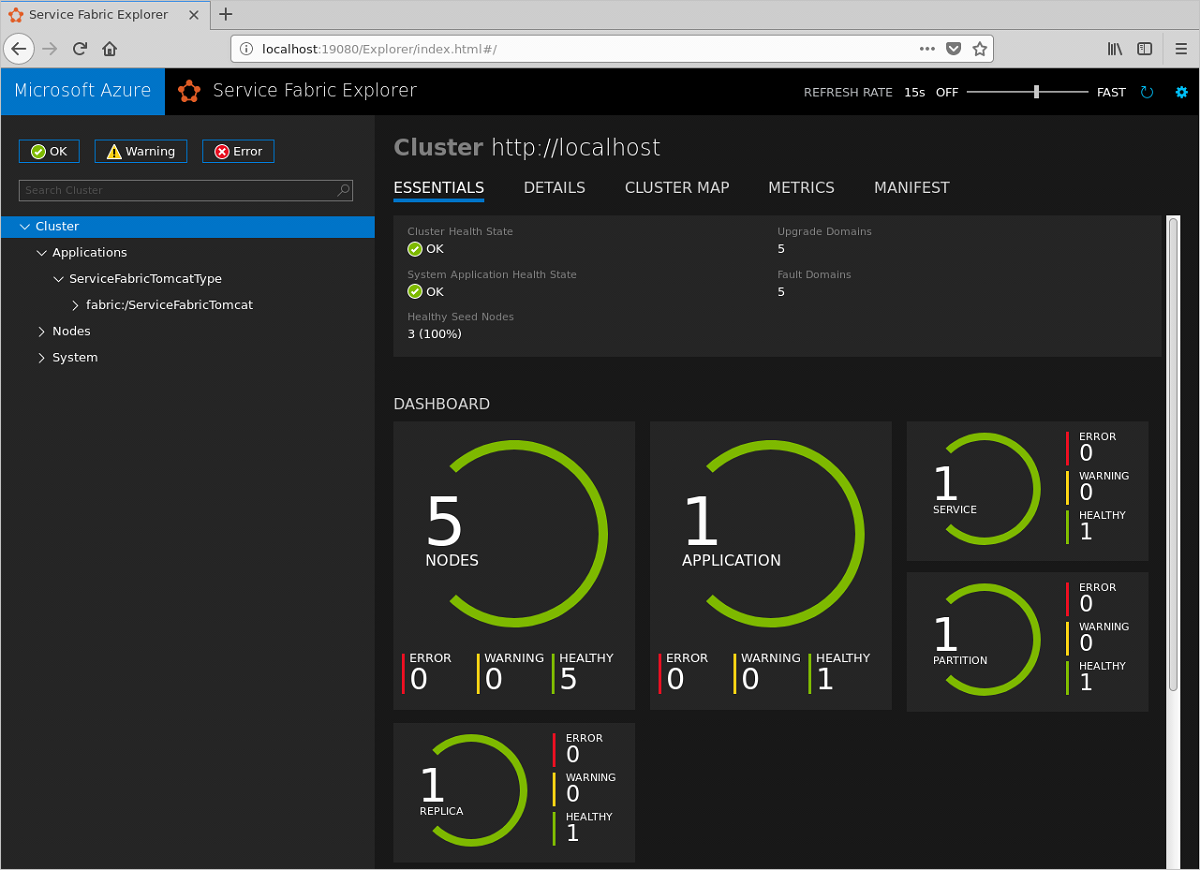 Expand the Applications node and note that there is now an entry for your application type, ServiceFabricTomcatType, and another for the first instance of that type. It may take a few minutes for the application to fully deploy, so be patient.