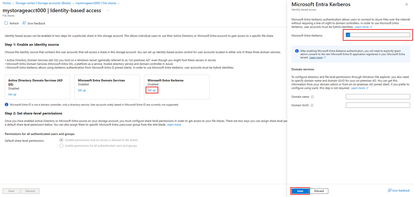 To enable Microsoft Entra Kerberos authentication using the Azure portal, follow these steps.