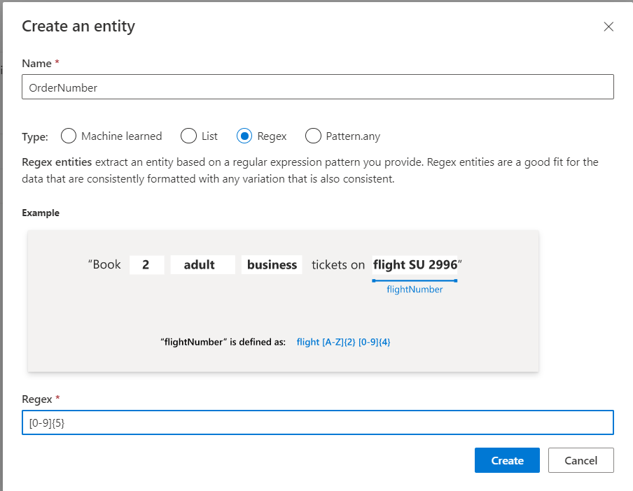 对于提取结构化文本或预定义字母数字值序列,使用正则表达式实体。 例如,可以将“OrderNumber”预定义为 5 个字符,包含从 0 到 9 的类型号。