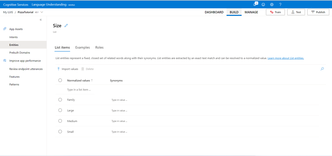 使用过程来创建列表实体。 创建列表实体后,不需要在意向中标记示例言语。 使用精确文本匹配列表项和同义词。 “大小”实体可以是列表类型,并且包含不同的大小,如“小”、“中”、“大”和“系列”。