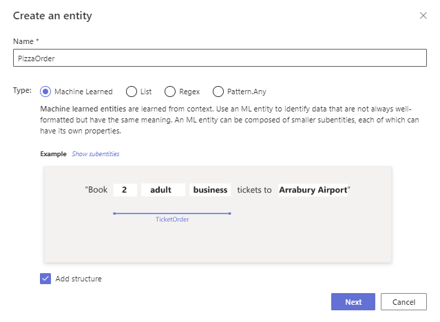 在“创建实体类型”对话框中,输入实体名称,然后选择“机器学习”,然后选择。 若要添加子实体,请选择“添加结构”。 然后选择 创建。