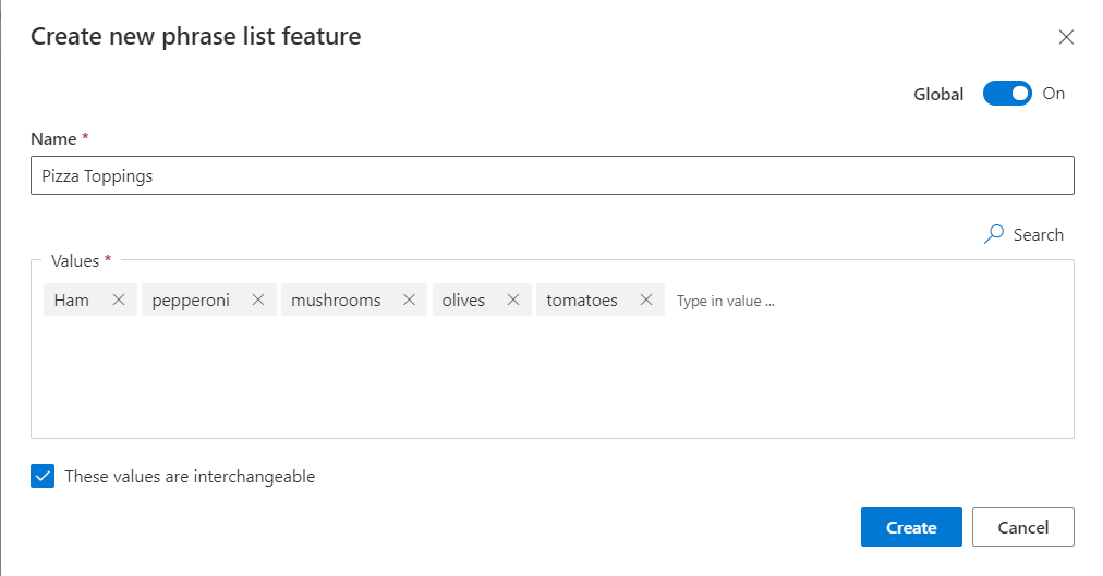 - 可以使用“全局”设置将短语列表应用于整个应用,或应用于特定模型(意向或实体)。 如果创建短语列表,并作为意向或实体的特征,则切换后不会设置为全局。 在这种情况下,切换指定该特征仅对该模型是本地的,因此对应用程序而言不是全局的。