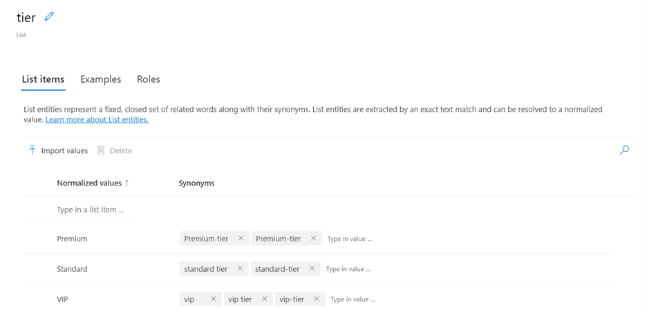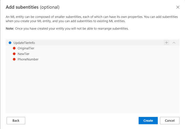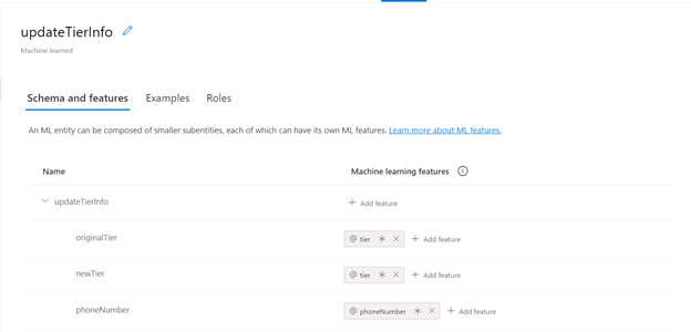 在此示例中,我们将创建两个实体,机器学习实体类型的“UpdateTierInfo”和列表实体类型的“层”。 Luis 还允许创建不同的实体类型。
