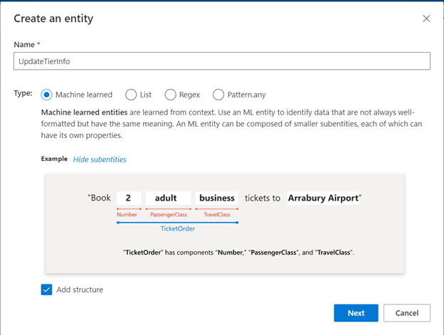 在出现的窗口中,输入“UpdateTierInfo”,并从可用类型中选择“机器学习”。 选中“添加结构”框,以便能够将结构添加到此实体。