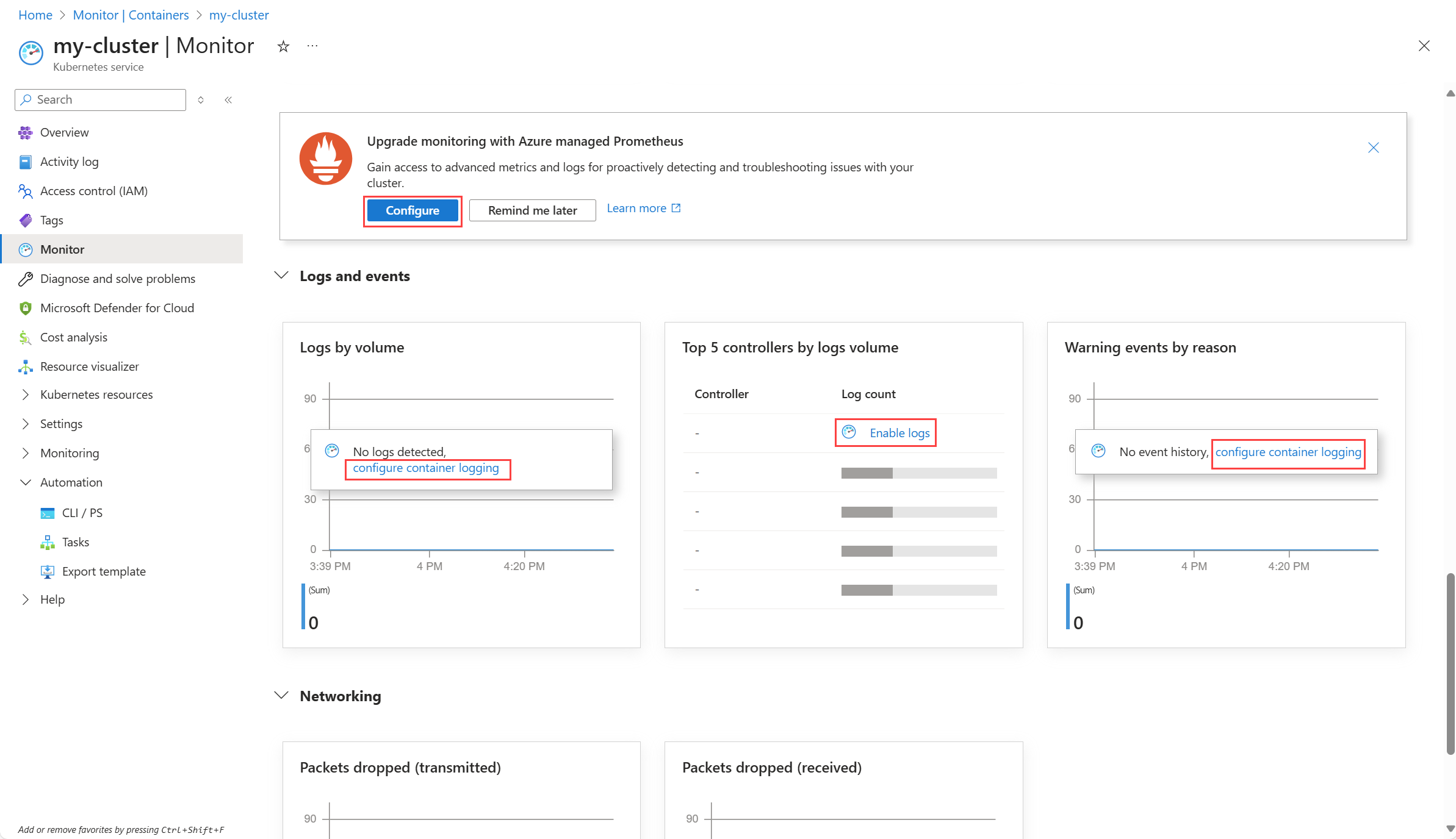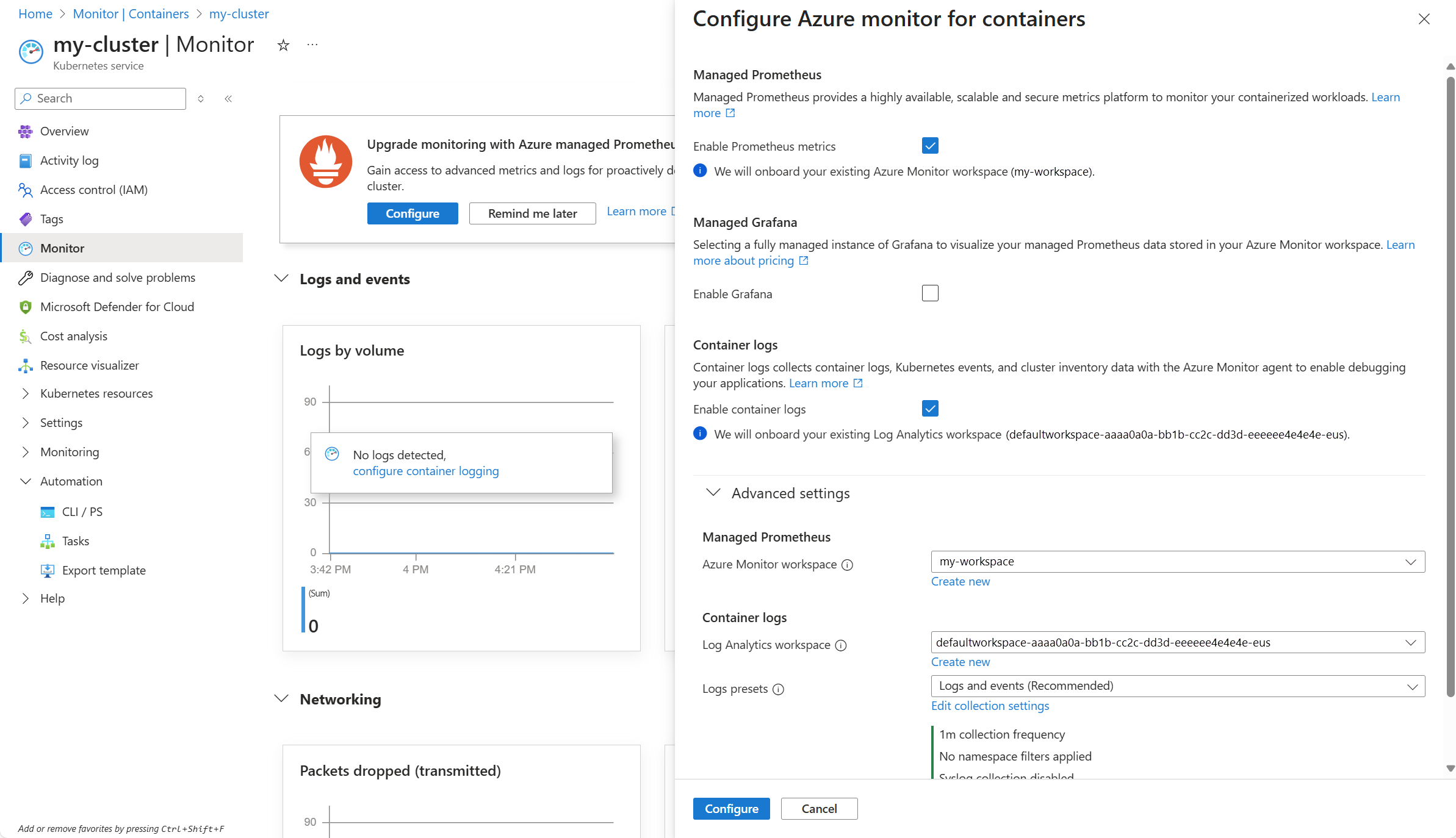 单击屏幕上的任意选项以 启用指标、 配置托管 Prometheus 或 配置容器日志记录 以打开群集的配置面板。 无论单击哪个链接,都会打开同一配置屏幕。