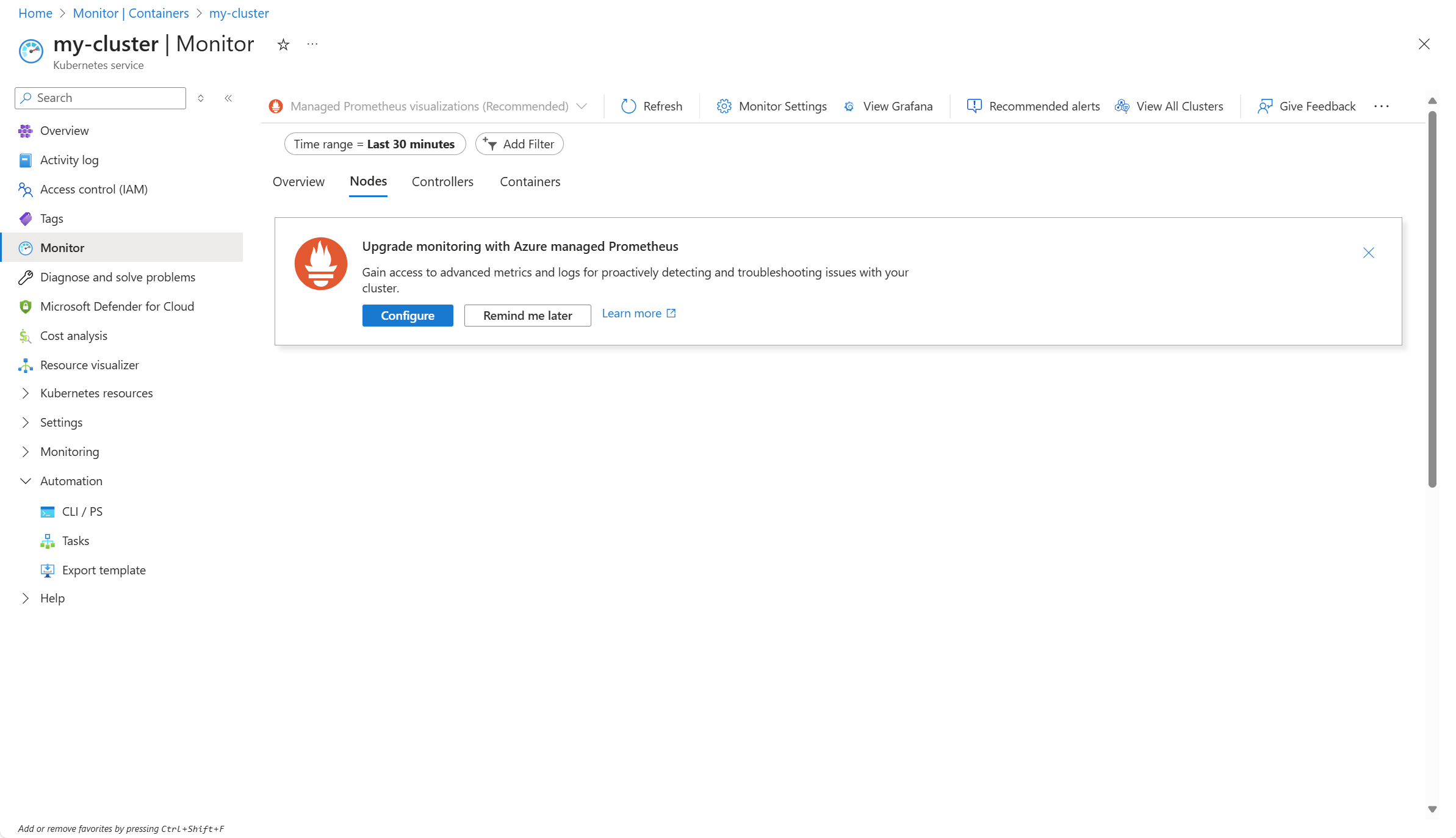 选择 节点、 控制器和 容器 ,并注意到这些选项卡处于禁用状态,并提供启用托管 Prometheus 的选项。