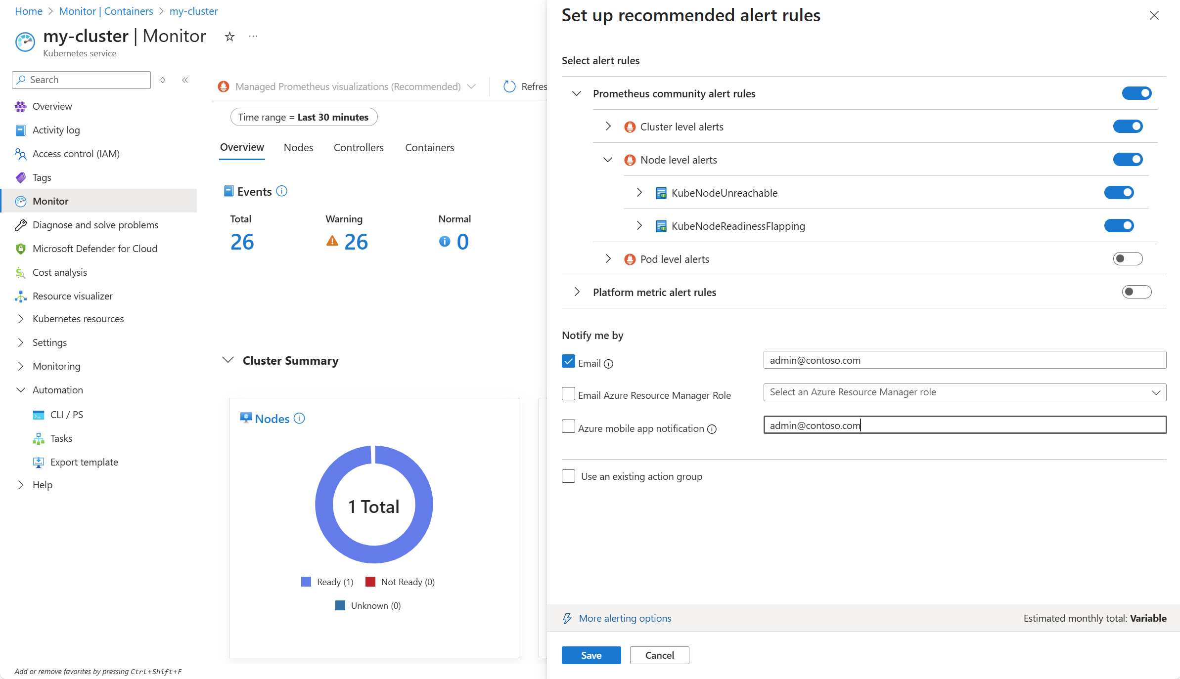 可以从社区为群集、节点和 Pod 级别定义的一组常见警报中进行选择。 启用所需的不同警报条件,然后提供一封电子邮件,以便在满足警报条件时发送通知。