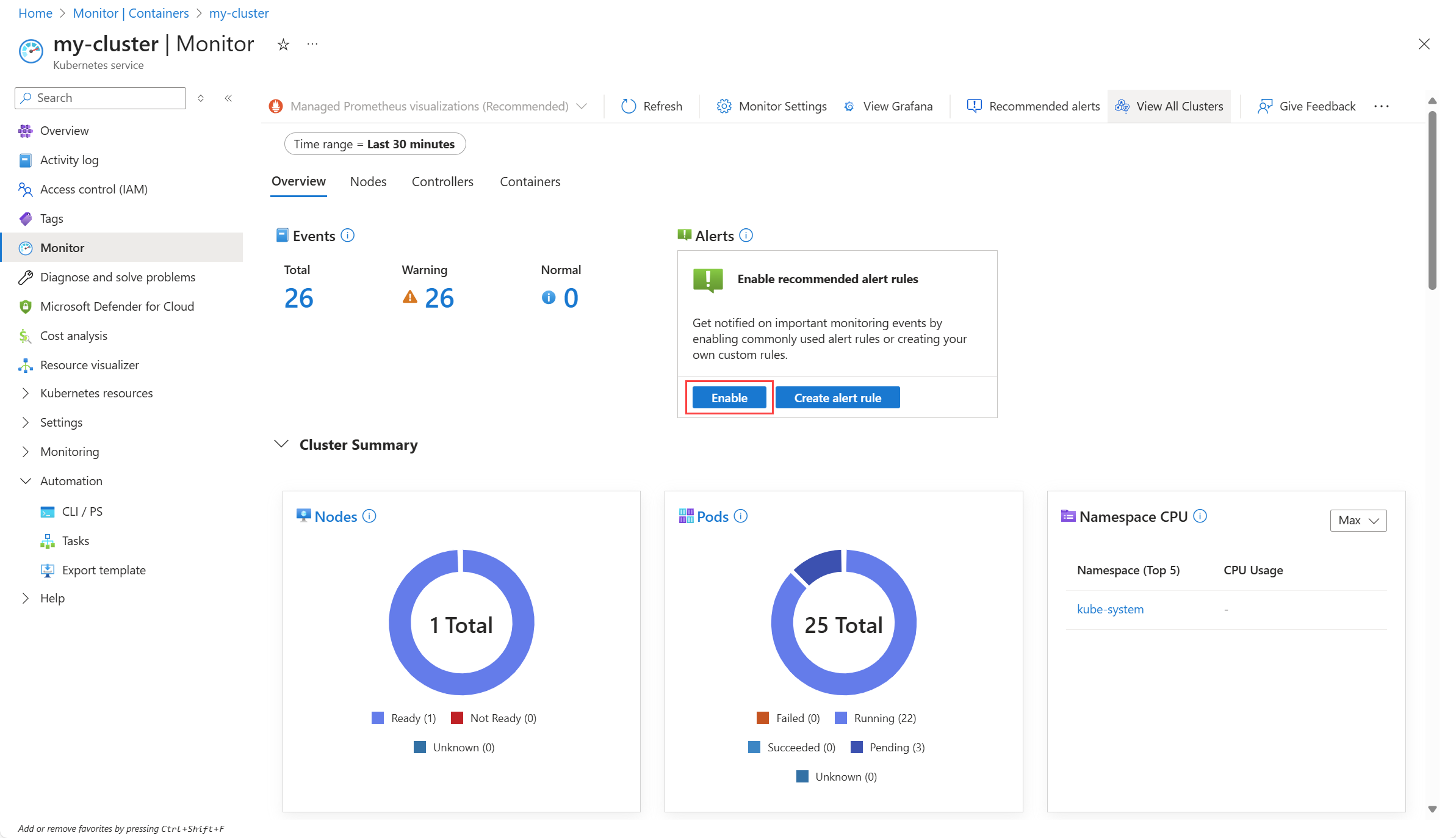 当指标或日志查询显示您的集群可能存在需要关注的问题时,Azure Monitor 中的警报会主动地通知您。 可以根据 Prometheus 指标快速启用一组常见的警报规则。