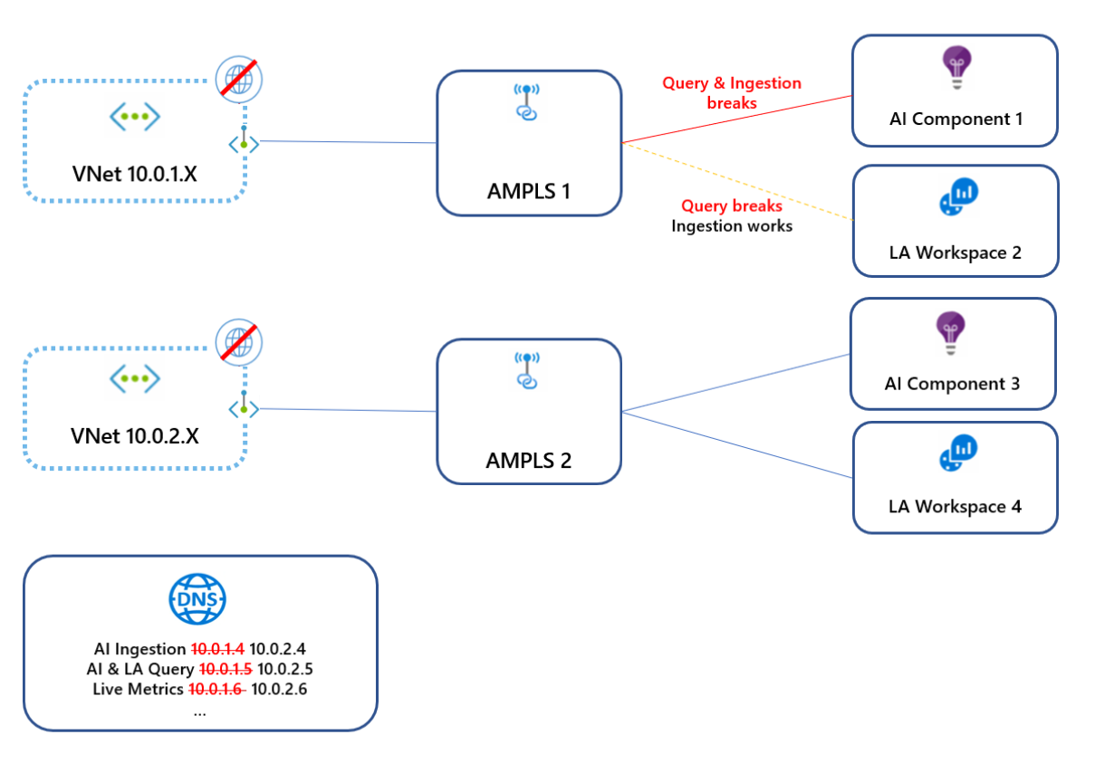 在下图中,虚拟网络 10.0.1.x 连接到 AMPLS1,这会创建将Azure Monitor终结点映射到 10.0.1.x 范围内的 IP 的 DNS 条目。 稍后,虚拟网络 10.0.2.x 连接到 AMPLS2,它会通过将相同的全局/区域终结点映射到范围 10.0.2.x 内的 IP 来覆盖相同的 DNS 条目。 由于这些虚拟网络未对等互连,因此第一个虚拟网络现在无法访问这些终结点。 若要避免此冲突,请为每个 DNS 仅创建一个 AMPLS 对象。