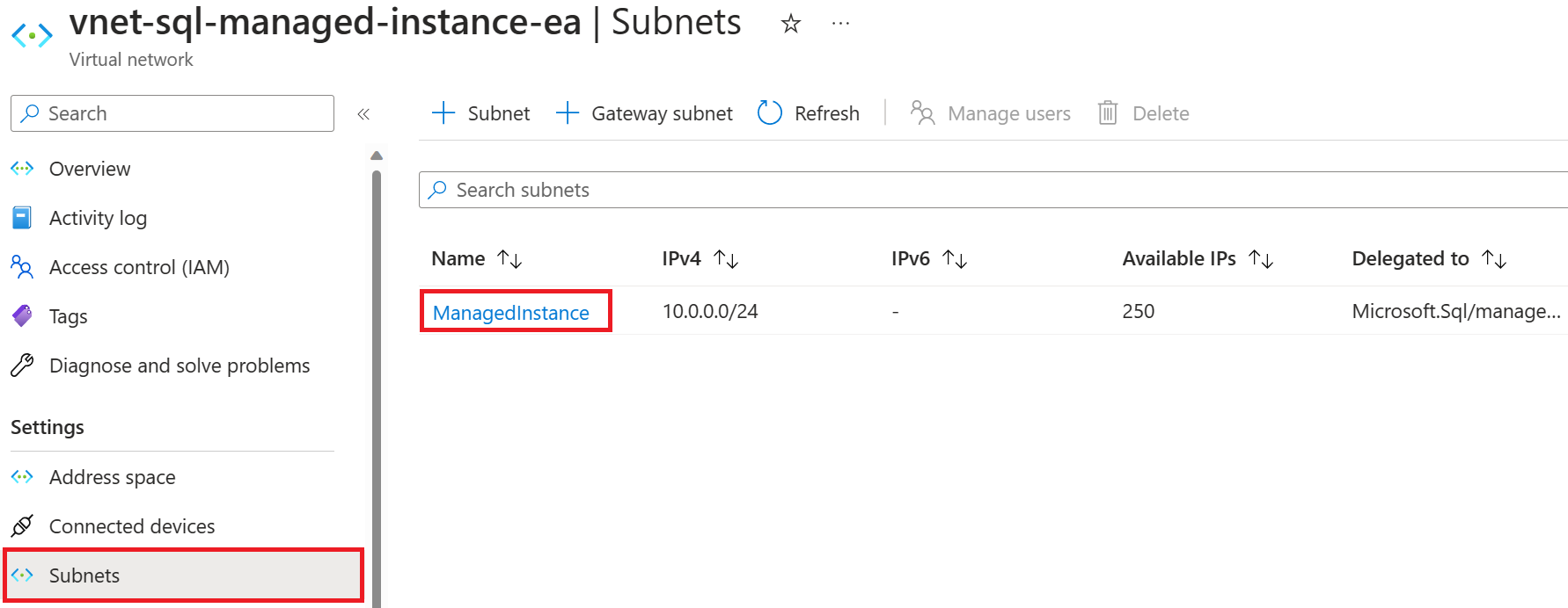 转到 Azure 门户中 的 SQL 托管实例,然后选择子网以打开 “子网 ”页。