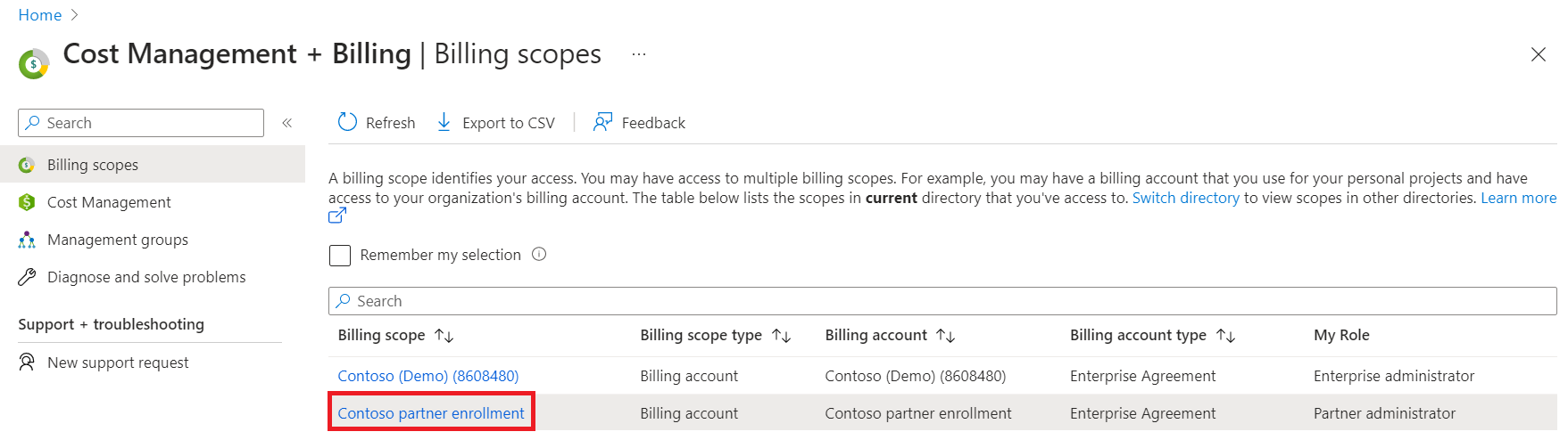 合作伙伴管理员可以在 Azure 门户中查看其客户注册列表(计费对象信息)。 每个客户的 EA 注册都表示为合作伙伴的计费对象信息。