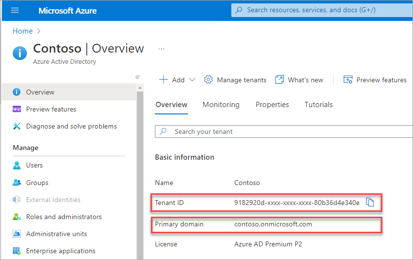 3. 在 Microsoft Entra“概述”页中,可以在“基本信息”部分中找到 Microsoft Entra 租户 ID 和主域名。