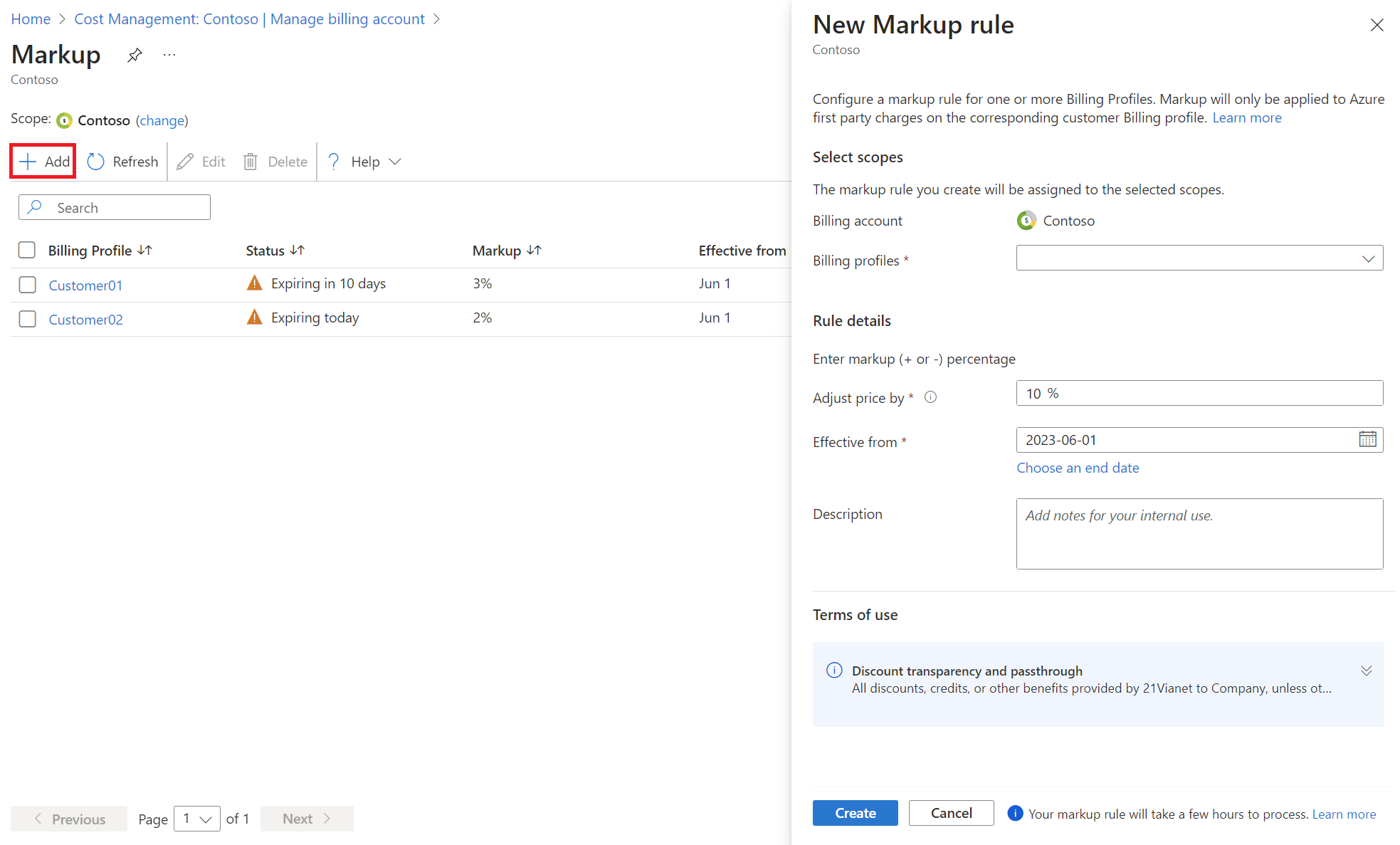 如果你是计费帐户或计费对象信息管理员,则可以为关联到你计费对象信息的客户创建并管理加价规则。 在定义的时间段内,每个客户计费对象信息只能设置一个加价规则。 加价规则仅适用于第一方 Azure 价格和费用的客户计费对象信息。