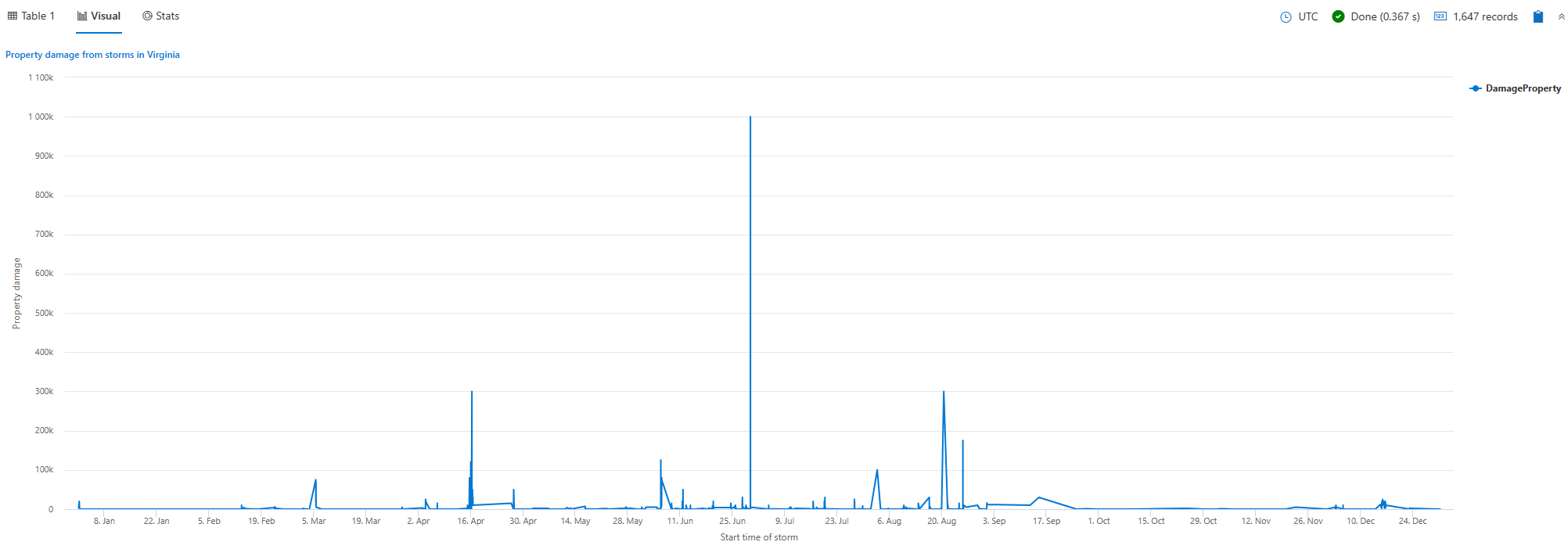 此查询检索弗吉尼亚州的风暴事件,专注于开始时间和财产损坏,然后在折线图中显示此信息。