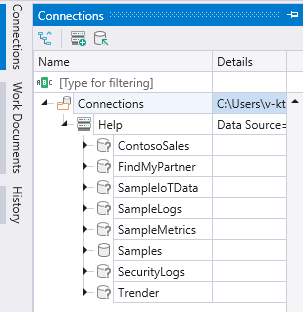 “ 连接” 面板列出所有配置的群集连接。 对于每个群集,它都会列出数据库、表和列。 选择要在主面板中为搜索或查询设置上下文的项。 若要将名称复制到搜索或查询面板,请双击该项。