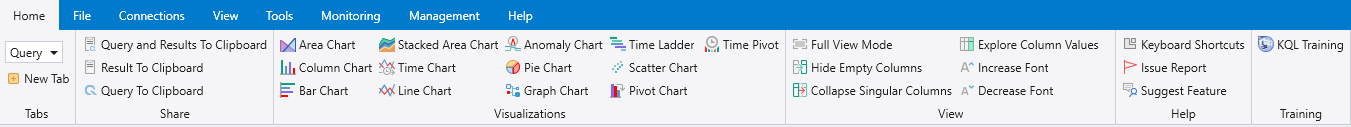 | 选项 | 打开用于配置应用设置的选项工具。 有关详细信息,请参阅 Kusto.Explorer 选项。 |