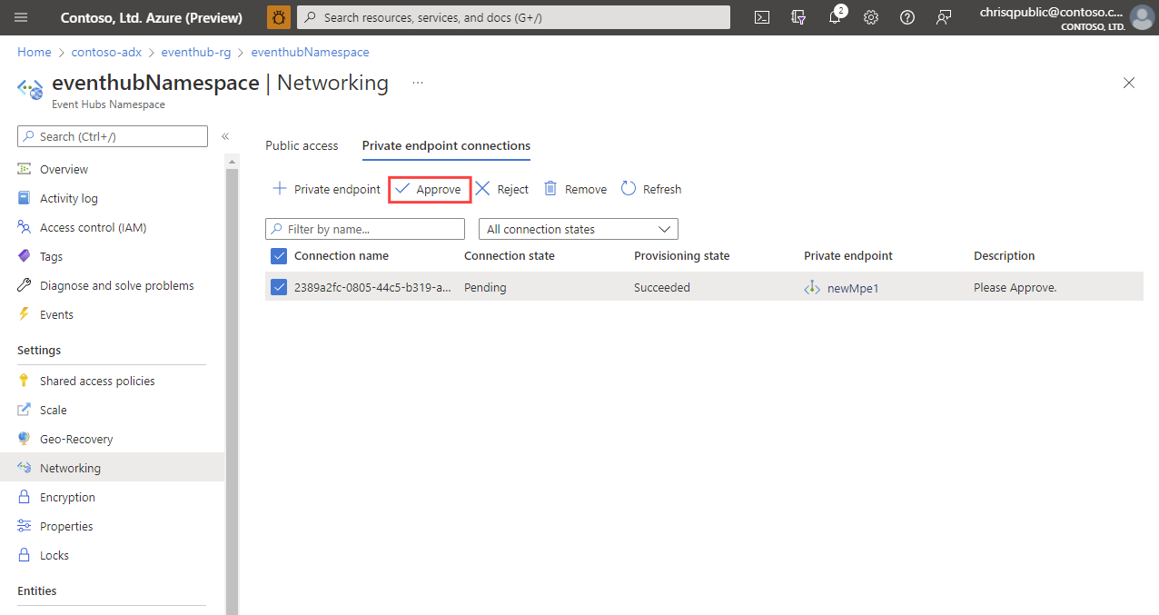 无论使用哪种方法创建托管专用终结点,都必须在目标资源上批准其创建。 若要为事件中心服务批准一个托管专用终结点,请执行以下操作: