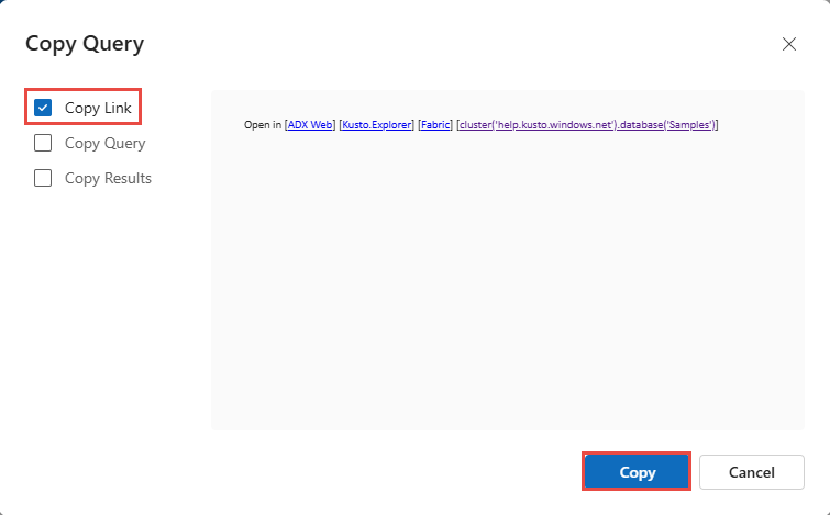 若要复制要与他人共享的链接以及查询文本,请执行以下步骤: