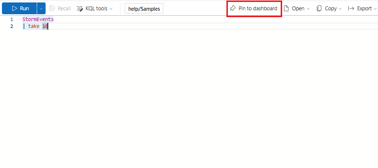 | 固定到仪表板 | 在 Azure 数据资源管理器仪表板中显示查询。 |