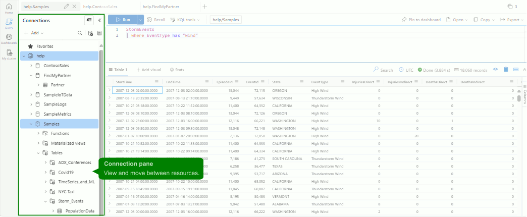若要了解如何添加连接,请参阅在 Azure 数据资源管理器 Web UI 中添加群集连接。