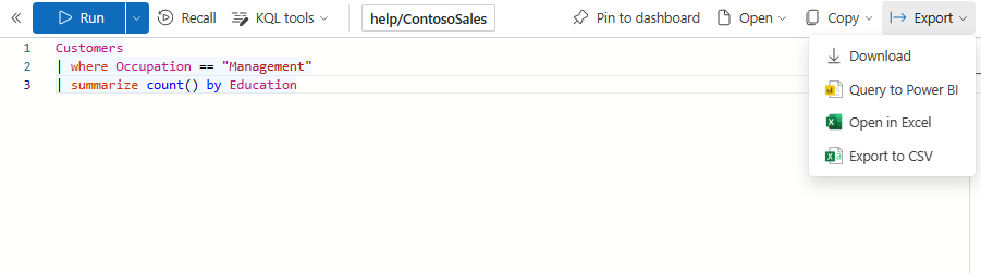 在查询页工具栏中,有多个选项可用于管理查询和查询结果。 可以将查询固定到仪表板、复制查询、复制查询结果,以及将数据导出为 Power BI、Excel 和 CSV 格式。 有关详细信息,请参阅从 Azure 数据资源管理器 Web UI 共享查询。