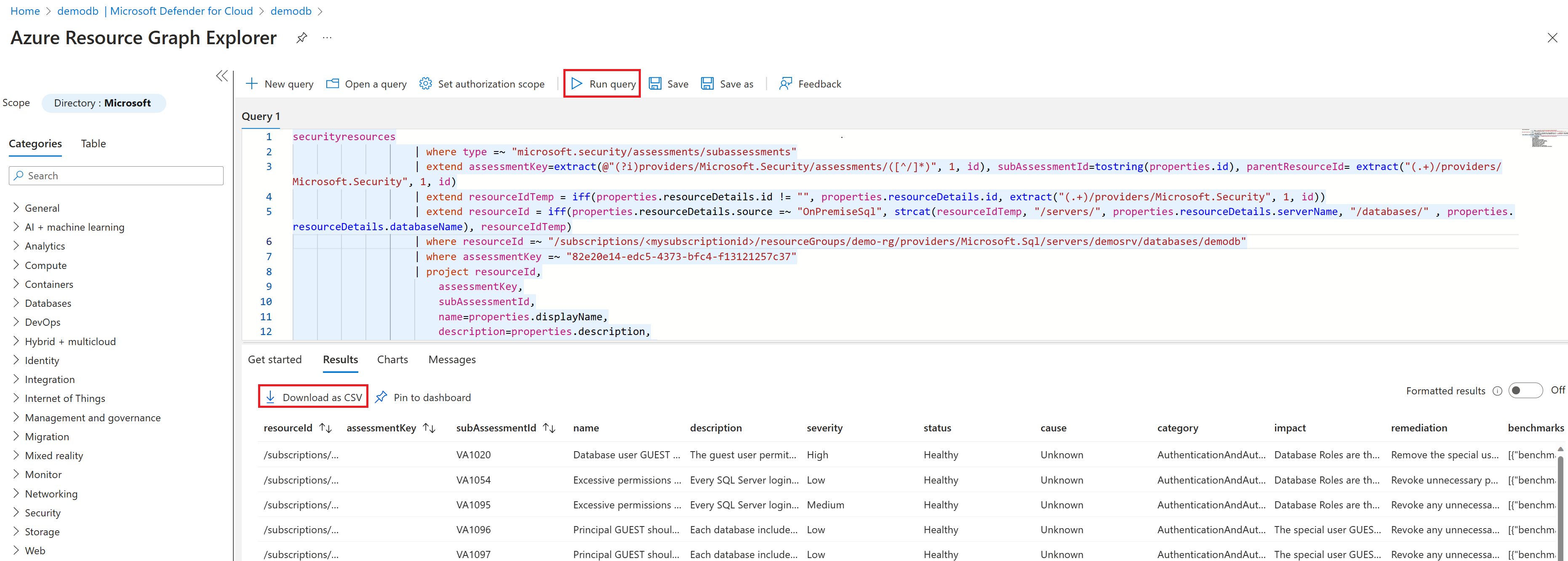 securityresources | where type =~ "microsoft.security/assessments/subassessments" | extend assessmentKey=extract(@"(?i)providers/Microsoft.Security/assessments/([^/]*)", 1, id), subAssessmentId=tostring(properties.id), parentResourceId= extract("(.+)/providers/Microsoft.Security", 1, id) | extend resourceIdTemp = iff(properties.resourceDetails.id != "", properties.resourceDetails.id, extract("(.+)/providers/Microsoft.Security", 1, id)) | extend resourceId = iff(properties.resourceDetails.source =~ "OnPremiseSql", strcat(resourceIdTemp, "/servers/", properties.resourceDetails.serverName, "/databases/" , properties.resourceDetails.databaseName), resourceIdTemp) | where resourceId =~ "/subscriptions/resourcegroups/rgname/providers/microsoft.sql/servers/servername/databases/dbname" | where assessmentKey =~ "82e20e14-edc5-4373-bfc4-f13121257c37" | project resourceId, subscriptionId, assessmentKey, subAssessmentId, name=properties.displayName, description=properties.description, severity=properties.status.severity, status=properties.status.code, cause=properties.status.cause, category=properties.category, impact=properties.impact, remediation=properties.remediation, benchmarks=properties.additionalData.benchmarks选择 运行查询。