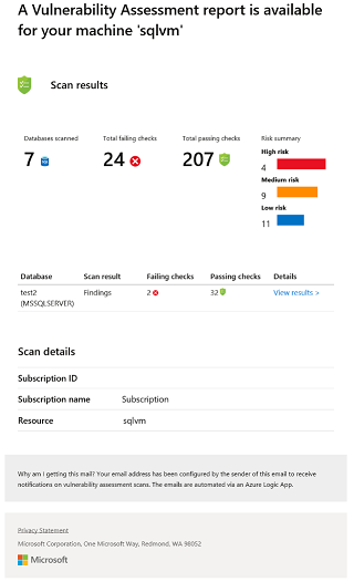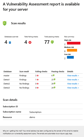 Defender for SQL 的漏洞评估(VA)功能每周扫描数据库,并生成任何已识别错误配置的报告。