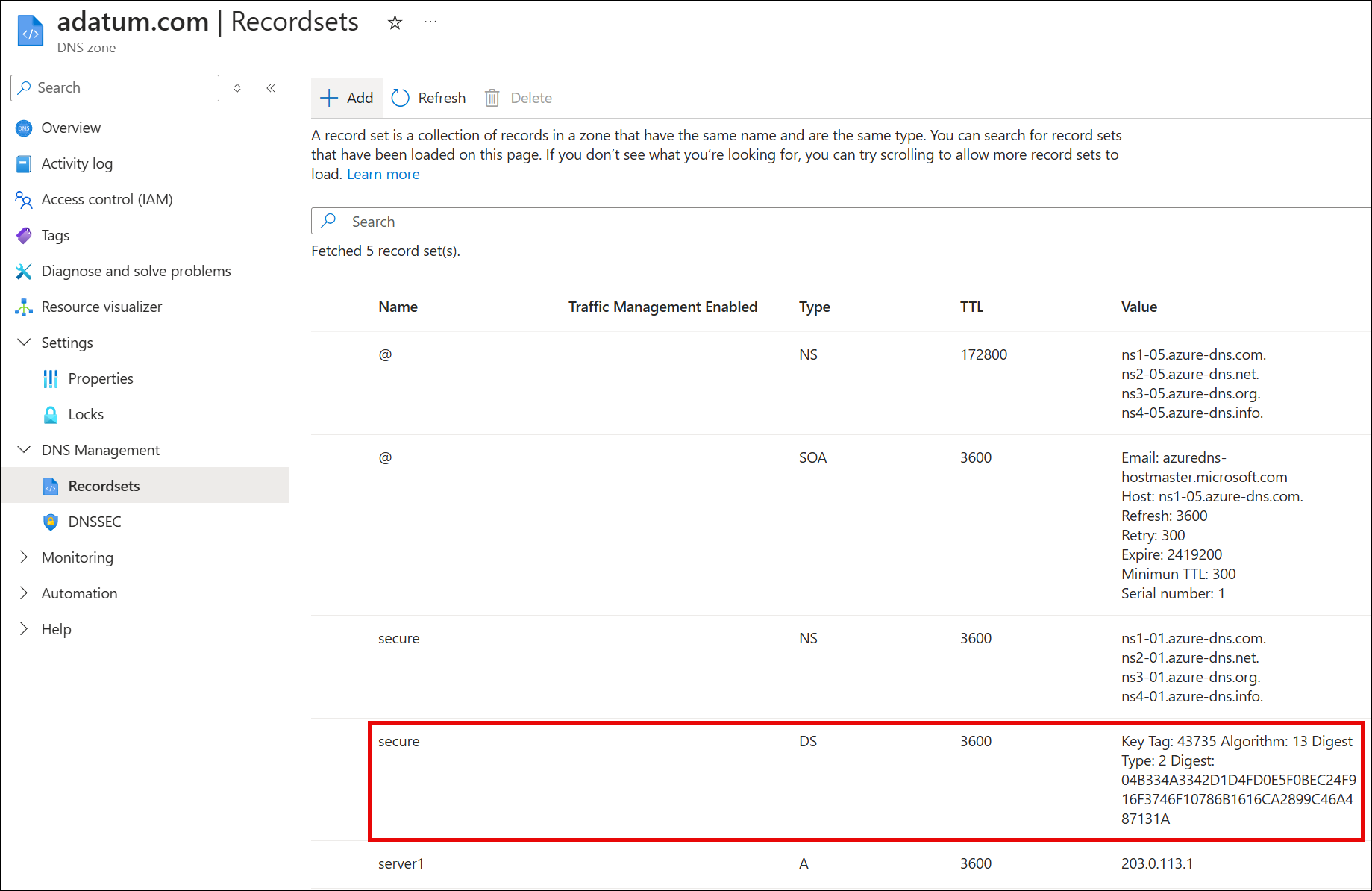 2. 如果你拥有父区域,可直接将 DS 记录添加到父区域。 以下示例演示如何将 DS 记录添加到子区域 secure.adatum.com 的 DNS 区域 adatum.com(在这两个区域都使用 Azure 公共 DNS 进行托管时)