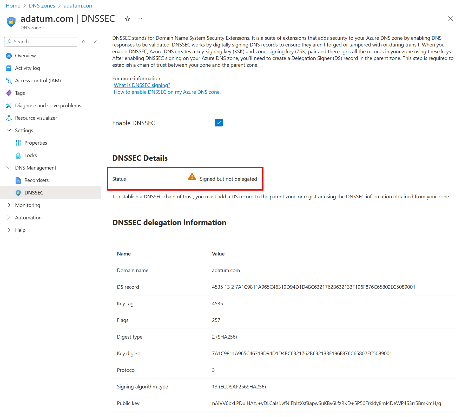使用 Azure 门户通过 DNSSEC 对区域进行签名: