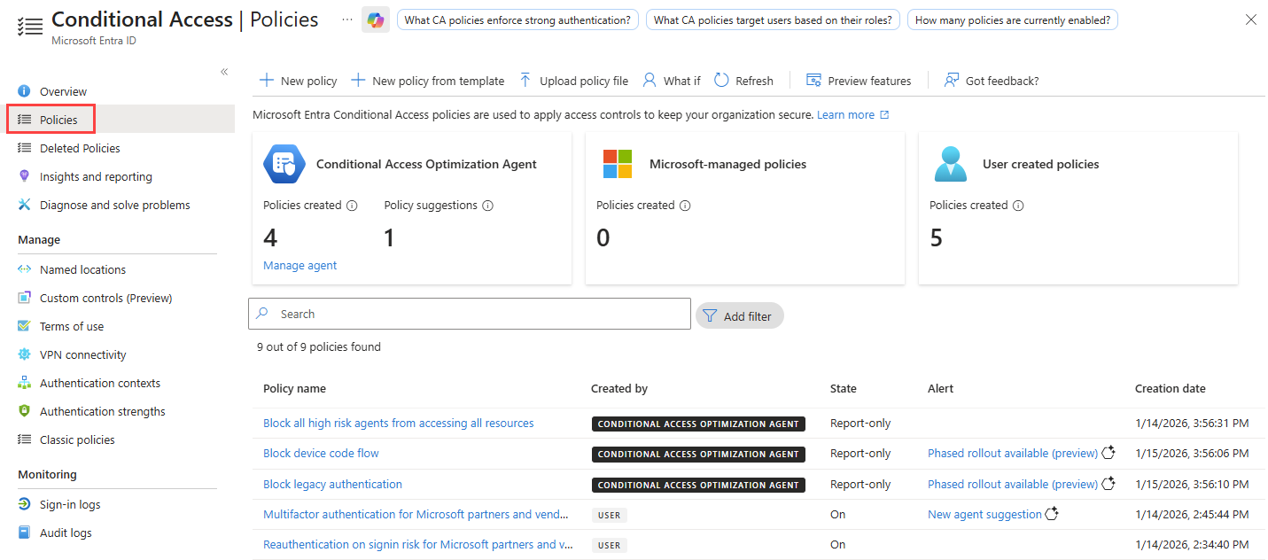 策略页列出了租户中的所有策略,包括仅报告策略,以及由条件访问优化代理程序创建的策略(如果适用)。 此处提供了筛选、查看“What if”方案以及创建新策略的选项。