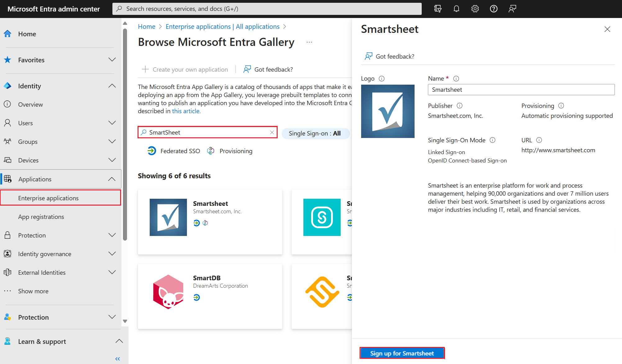 此时会打开“浏览 Microsoft Entra 图库”窗格。 在此示例中,我们使用 SmartSheet。