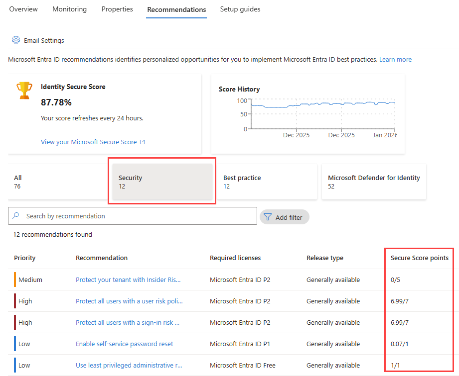 - 浏览到 Entra ID>概述>建议。 选择 “安全 筛选器”选项,仅查看标识安全功能分数中包含的建议。