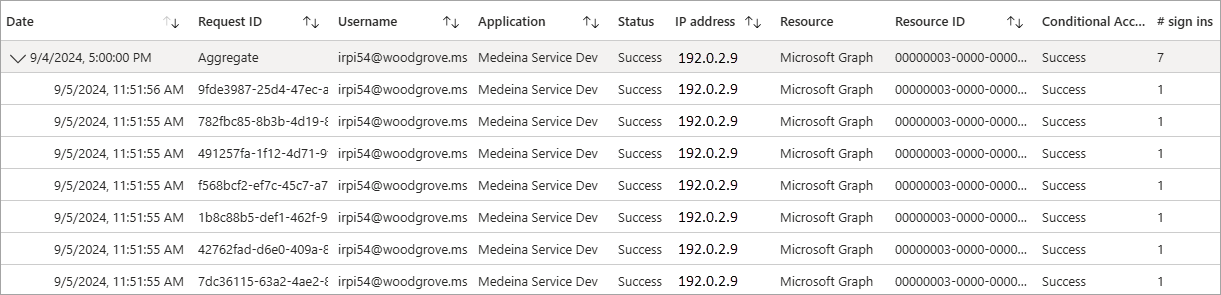如果只有时间和日期不同,Microsoft Entra 记录的多个登录的信息完全相同,则这些登录来自同一实体,并且会聚合成单个行。 如果某个行有多个相同登录(发出的日期和时间除外),则“登录数”列中的值将大于 1。 这些聚合登录的时间戳看起来也可能相同。 可将“时间聚合”筛选器设置为 1 小时、6 小时或 24 小时。 可以展开该行来查看所有不同的登录及其不同的时间戳。