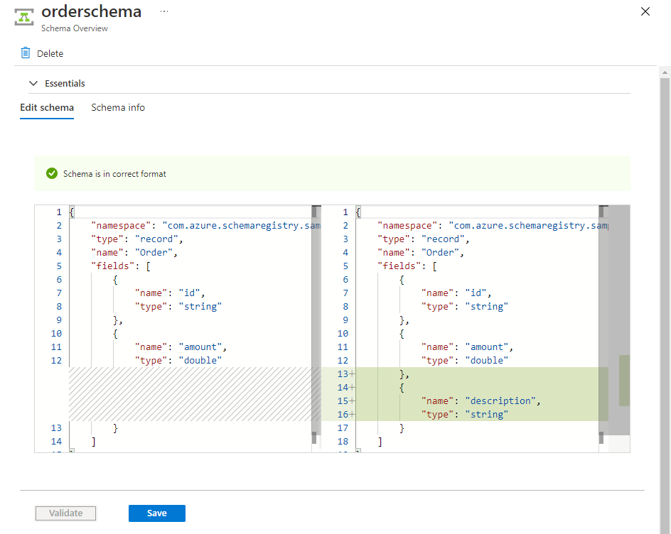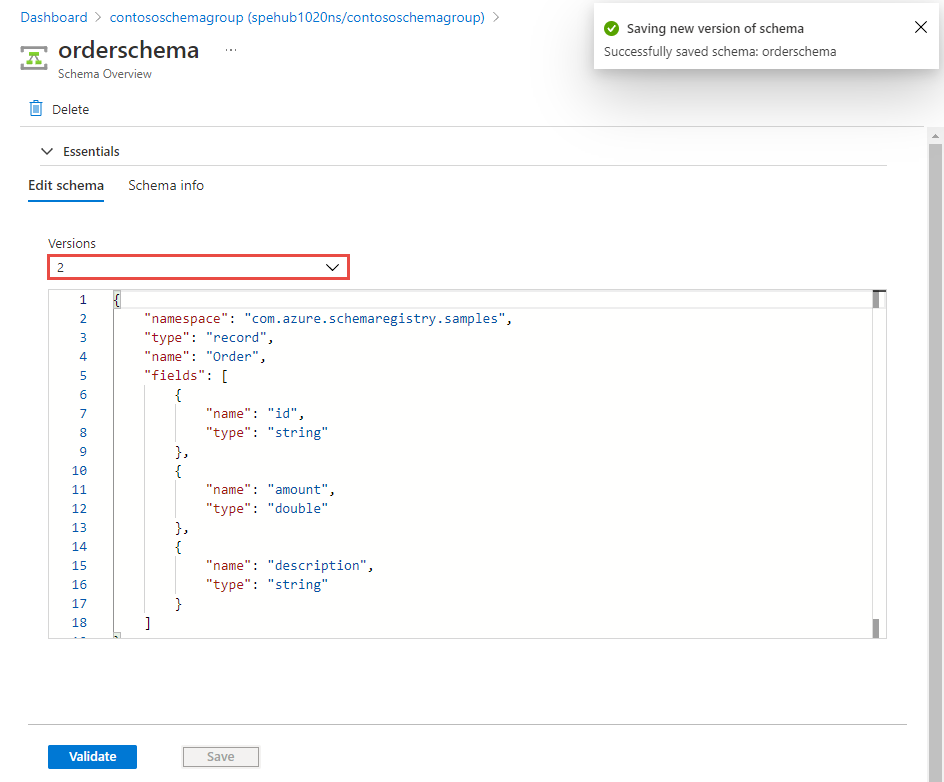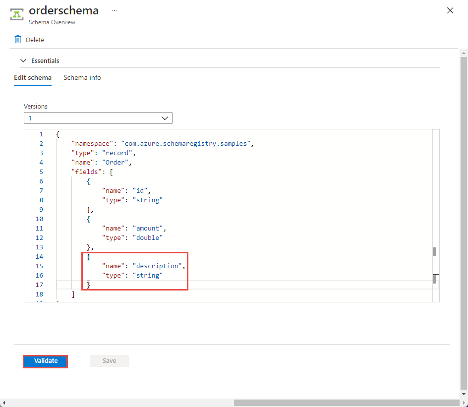 更新文本框中的架构,然后选择“ 验证”。 在以下示例中,向模式添加一个名为
