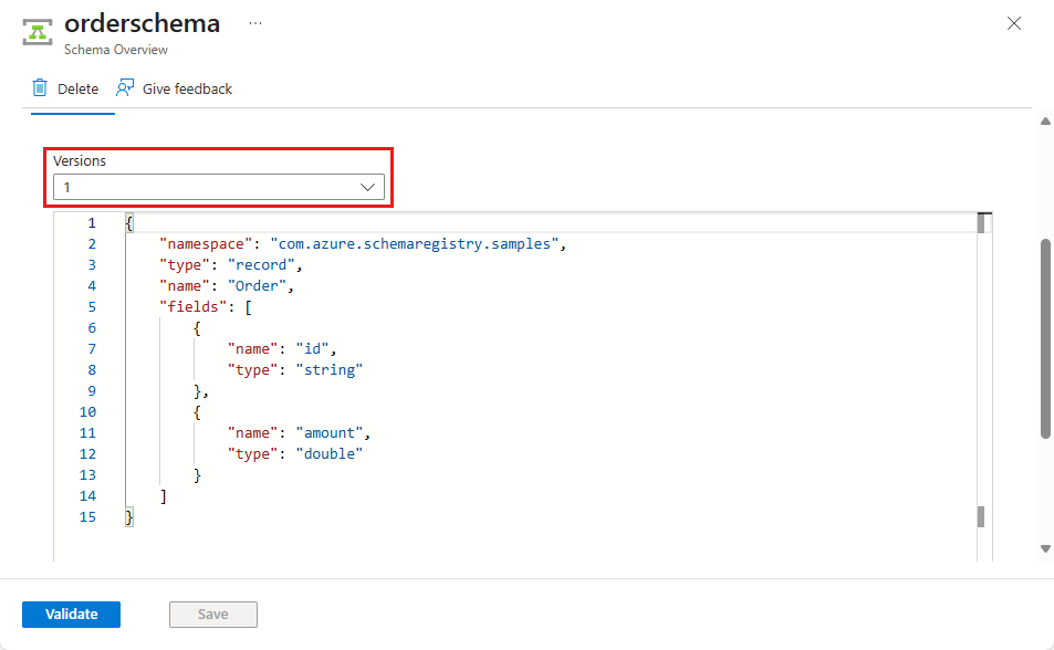 { "namespace": "com.azure.schemaregistry.samples", "type": "record", "name": "Order", "fields": [ { "name": "id", "type": "string" }, { "name": "amount", "type": "double" } ] }选择 创建。