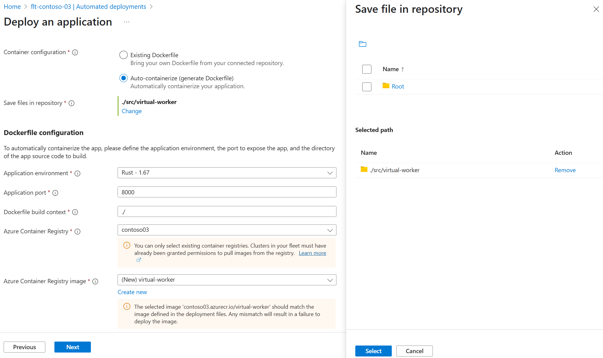 若要准备要在 Kubernetes 上运行的应用程序,需要将其构建到容器注册表中存储的容器映像中。 Dockerfile 提供有关如何生成容器映像的说明。 如果源代码存储库还没有 Dockerfile,则自动部署可以为你生成一个。
