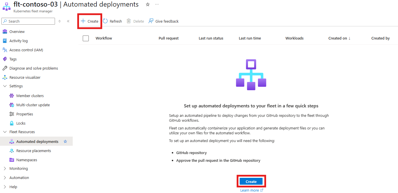Azure Kubernetes Fleet Manager 自动部署可用于生成应用程序,并将应用程序从代码存储库部署到机群中的一个或多个 AKS 群集。 自动化部署简化了设置 GitHub Action 工作流以生成和部署代码的过程。 连接后,你所做的每个新提交都会运行管道。