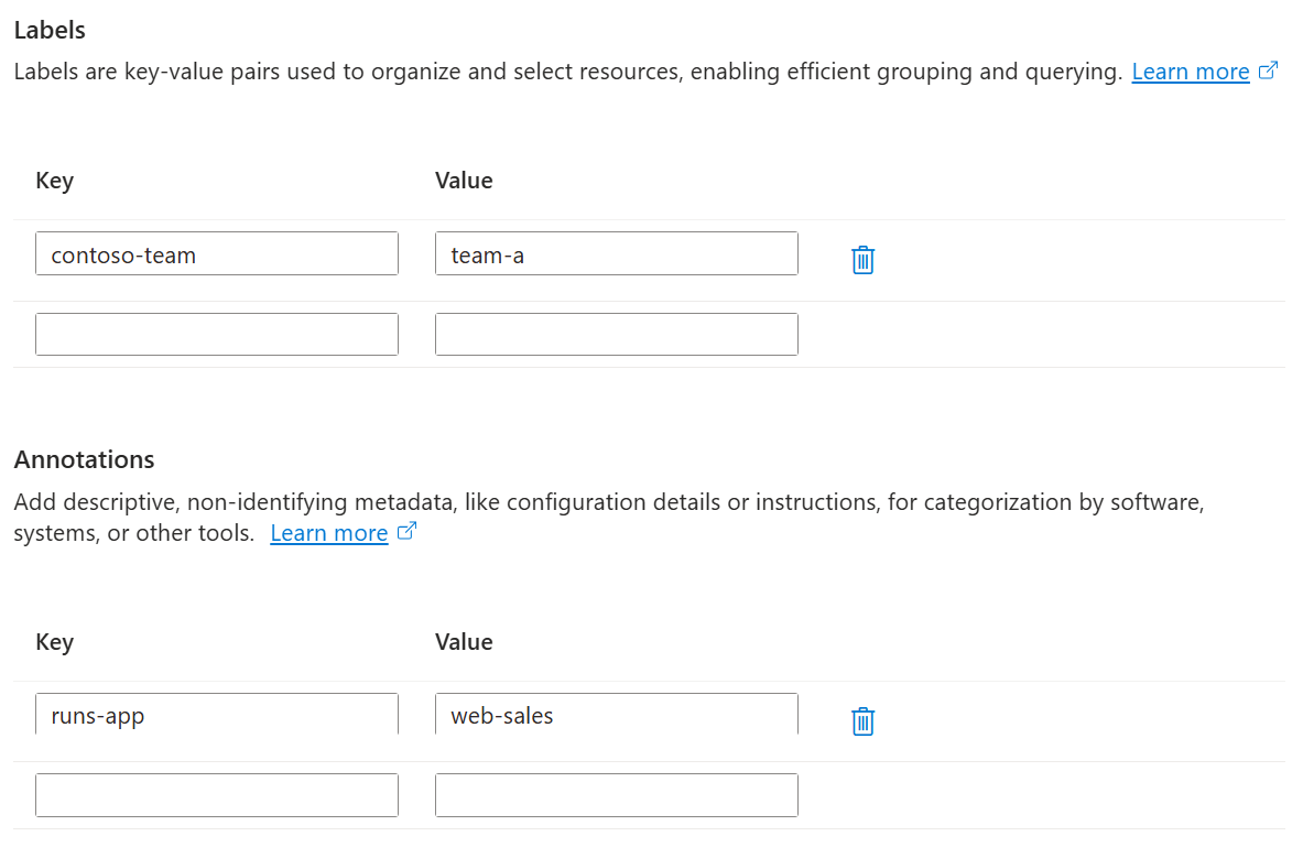 定义可选的 Kubernetes 标签和注释,以及 Azure 资源管理器 (ARM) 标记,这些标记提供可用于自动化和资源管理的元数据。
