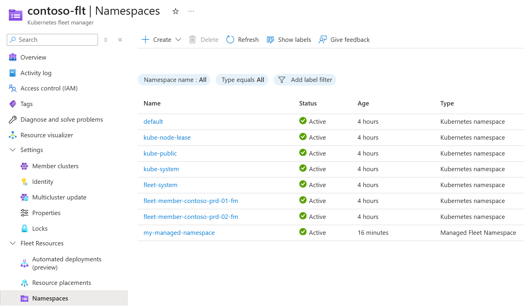 查看托管车队名称空间,您可以使用 az fleet namespace list 命令访问。
