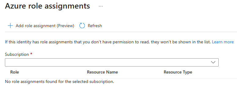 在托管标识资源的左侧导航中选择 Azure 角色分配 选项卡。 这会打开 “Azure 角色分配 ”窗格。