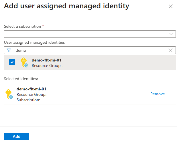 选择 “添加” ,将用户分配的托管标识添加到 Fleet Manager。